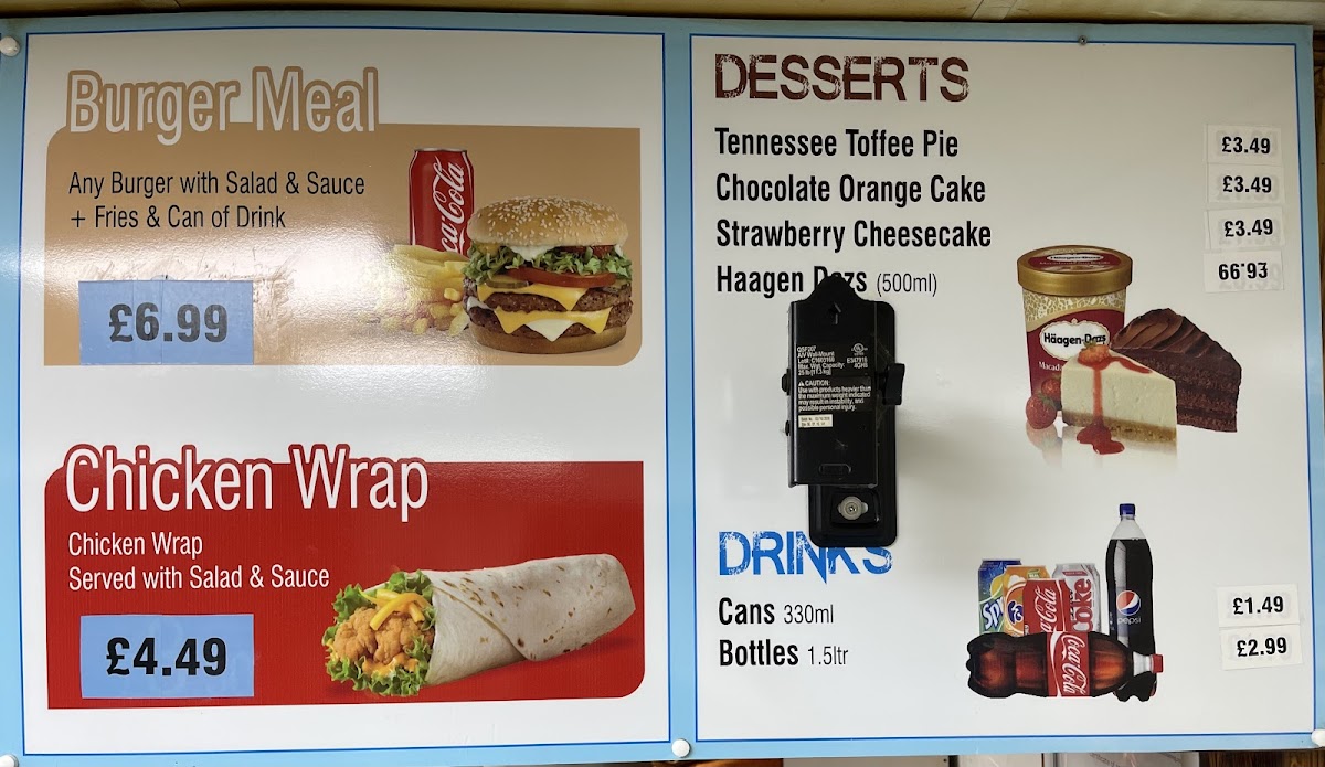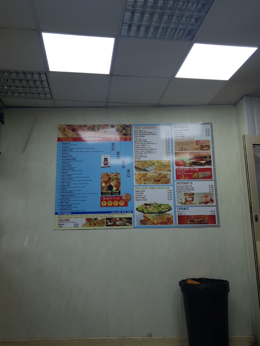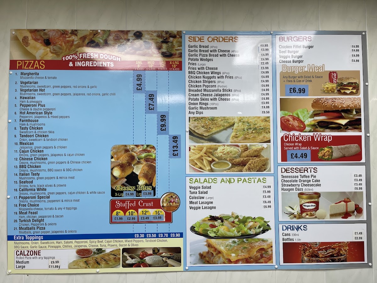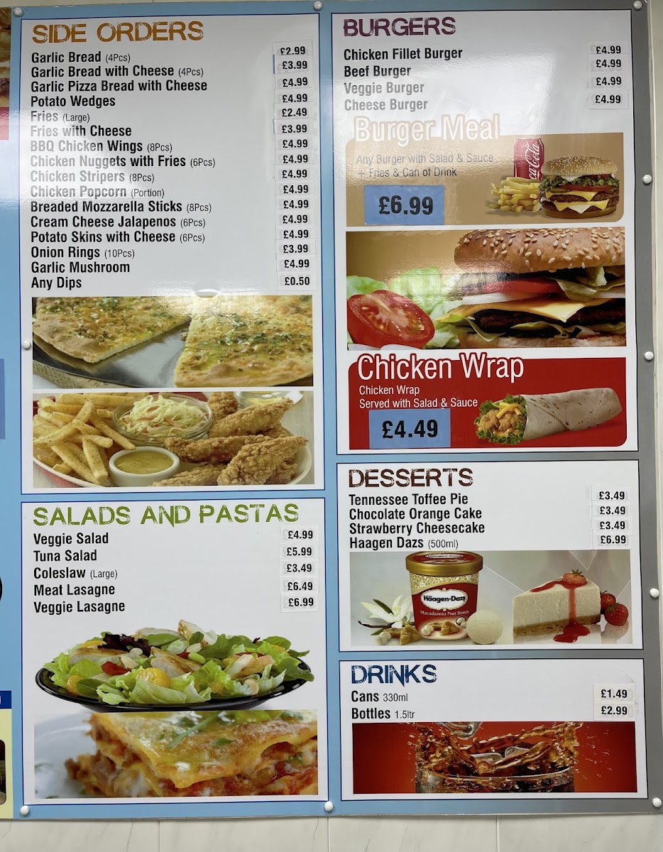 The menu at Night Star Pizza offers a delightful selection of dishes, catering to a variety of tastes and preferences. For starters, you can enjoy a fresh Veggie Salad or Tuna Salad, or opt for a creamy Coleslaw. If you're in the mood for something hearty, their Meat Lasagne and Veggie Lasagne are popular choices. The burger section features a range of options, including the juicy Chicken Fillet Burger, the classic Beef Burger, the delicious Veggie Burger, and a savory Cheese Burger. For those looking for sides, there's a tempting variety like Garlic Bread, Garlic Bread With Cheese, Garlic Pizza Bread With Cheese, crispy Potato Wedges, and golden Fries. Don’t forget to treat yourself to dessert with options such as the rich Tennessee Toffee Pie, indulgent Chocolate Orange Cake, or creamy Strawberry Cheesecake. They also offer a refreshing selection of Haagen Dazs ice cream. As for drinks, you can choose from a range of Cans and Bottles. The pizza menu is filled with mouth-watering classics like Margherita, Vegetarian, and Vegetarian Hot, alongside the ever-popular Pepperoni Plus and tropical Hawaiian. Whether you're in the mood for a light salad or a full meal, Night Star Pizza’s diverse menu promises something for everyone.